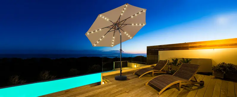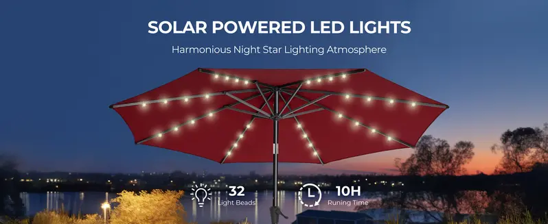 10Ft Solar Patio Umbrella - Solar Lights LED Lighted Outdoor Market Table Umbrella, UPF50+ UV Protection with Push Button Tilt, Crank for Pool Deck and Garden