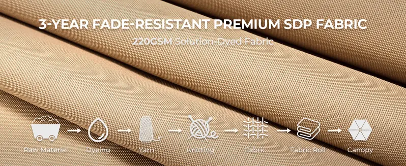PREMIUM CANOPY: High-quality 10ft 220gsm solution-dyed fabric with UPF50+ anti-UV coating provides 3-year fade-resistant, 99.9% UV-resistant, and water-repellant properties. Effectively blocks harmful UV rays including UVA and UVB to protect your health.