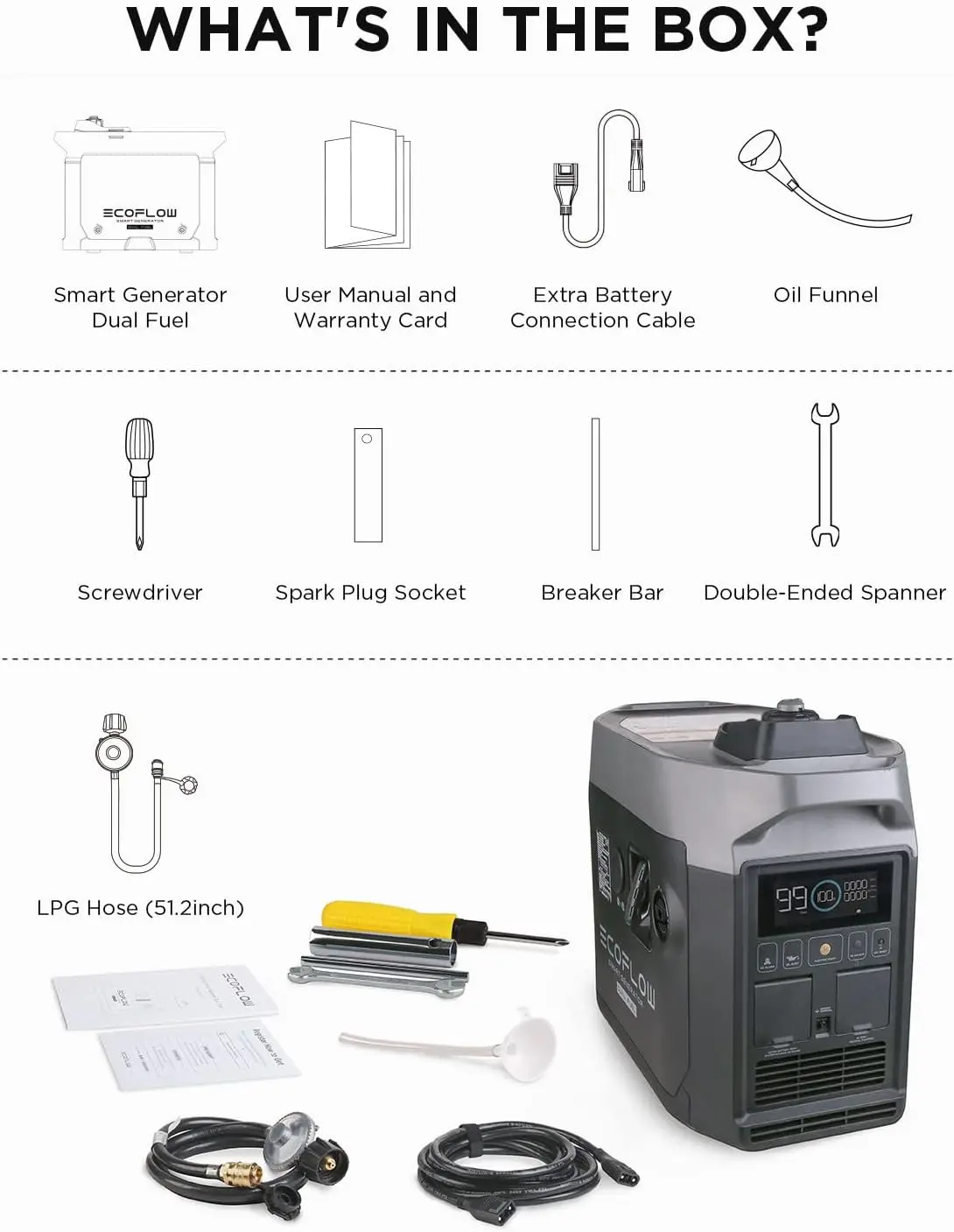 - 【Smart Control&Monitor】Automated on/off when connected to your power stations and power kits; Digitally integrated into your EcoFlow ecosystem with EcoFlow app ;Real-time running specs shown on LCD screen/APP about fuel level, alerts, maintenance notice, LPG consumption.