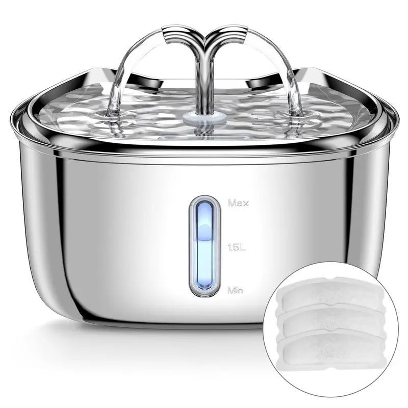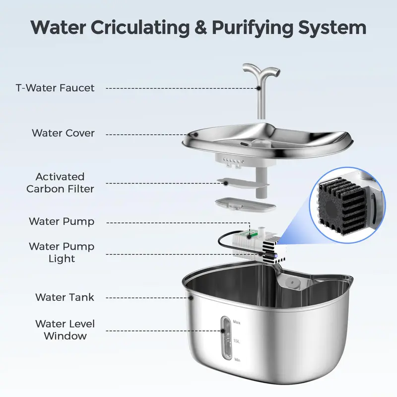 【Advanced Filtration System】: The pet water fountain features a 4-stage filtration system with non-woven fabric, activated carbon, ion exchange resin, and high-density filter material, ensuring clean and safe drinking water for your pets.